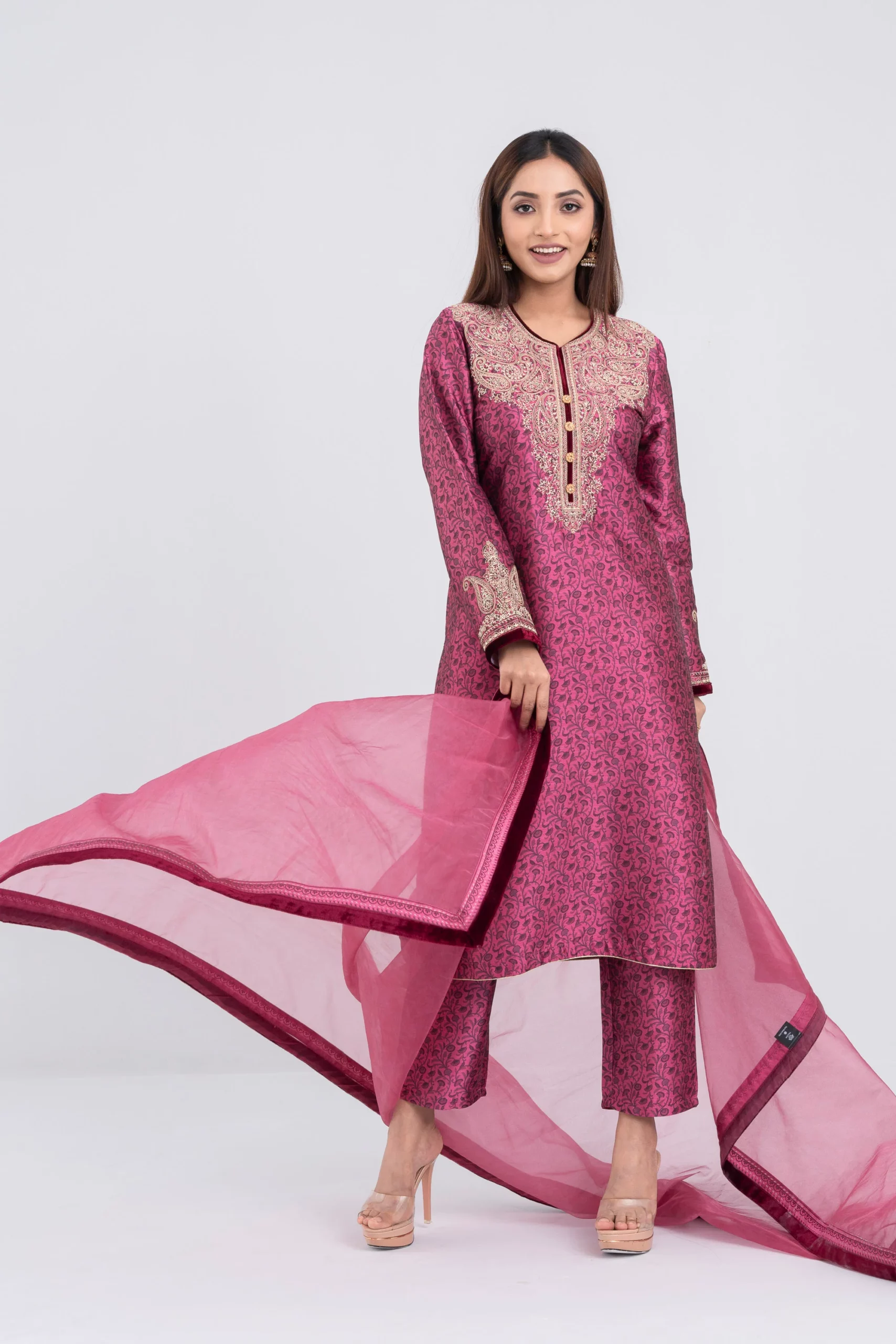 Women’s three-piece party wear embellished heavy embroired with print detailing